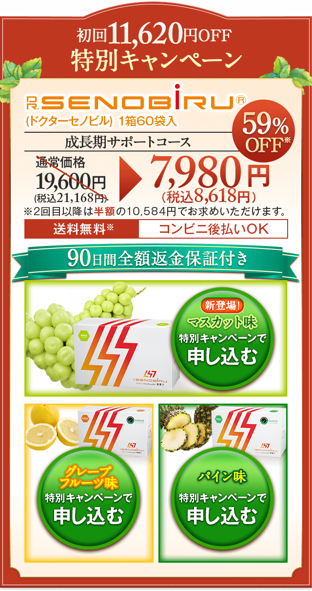 - 100名様限定で「成長期サポートコース」を申し込むと、1箱21,168円(税込)が初回57%OFFの9,720円(税込)、2回目以降も50%OFFの11,340円(税込)になります。