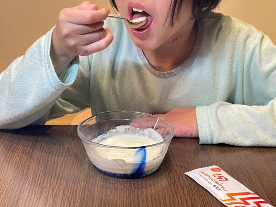 メーカーさんおすすめの方法でプレーンヨーグルトに混ぜても美味しいく摂取できます。